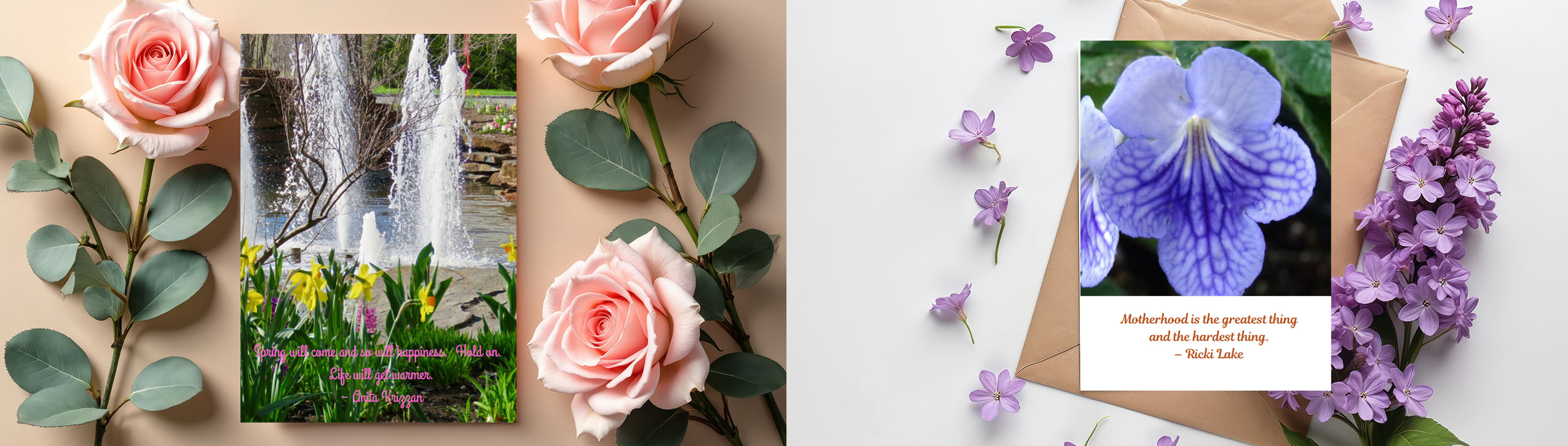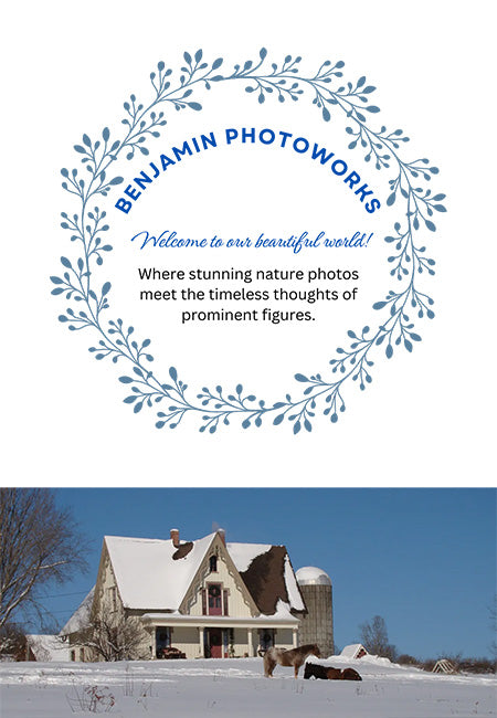Unique greeting cards with specialized packaging are the centerpiece of the Benjamin Photoworks enterprise. Blank inside, each card contains ample space for the sender’s private, personal message. The card front features a photo, commonly a shot of the natural world, paired with a carefully selected quotation from a writer, speaker, or other well-known individual. The card back displays the photo’s location and photographer as well as the company contact information. Unlike cards produced by big companies such as Hallmark and American Greetings, those offered by Benjamin Photoworks benefit from careful and attractive packaging. Envelopes are colorful and coordinated with the hues present in the photo, and cello bags showcase and protect each card while it’s on display. The physical details of our cards include 5 x7 inch size, glossy, or matte, 80 Lb. paper. Our customers tell us that they consider our cards to be “more than just a greeting card,” but a gift in itself. Beyond the card products, we also offer framed and matted photos of various sizes for use as wall art and shelf sitters.